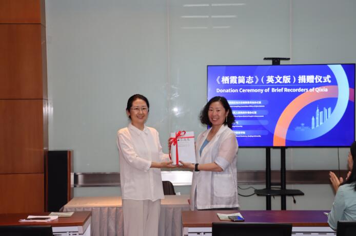捐赠仪式在南京大学仙林校区杜厦图书馆举行,栖霞区政协副主席,区档案馆馆长(区志办主任)任秋娴简要介绍了栖霞的历史沿革以及《栖霞简志》(英文版)的编纂目的、成书过程、主要内容和社会影响,杜厦图书馆办公室陈宏主任代表图书馆接受了捐赠,并表示《栖霞简志》(中、英文版)和《栖霞区志》的入藏将进一步丰富图书馆的藏书类别,图书馆将做好宣传推广和借阅管理工作,充分发挥志书的功效。南京大学海外教育学院赵文书院长主持了仪式,他高度评价了《栖霞简志》(英文版)的地位和作用,作为本校留学生了解栖霞的一扇窗口,它将让栖霞的形象变得更加立体和丰满。