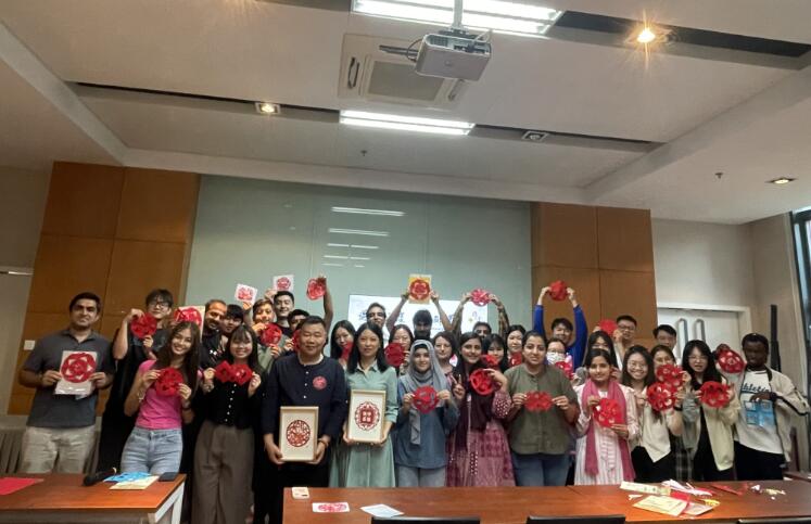 捐赠仪式结束后,参加传统非遗体验的留学生首先观看了栖霞形象宣传片,与方志静态的文字和图片呈现相比,宣传视频更加动态直观地展现了栖霞的过去、现在和未来,拉近了留学生与学习、生活的这片土地的情感距离。接着,南京市非遗剪纸传承人、丹枫乐学剪纸工艺坊名师工作室领衔人葛传民老师,为留学生们带来了一堂精彩的剪纸艺术鉴赏课,留学生们听得津津有味,纷纷拿起彩纸和剪刀,跃跃欲试。在实操环节,考虑到中国传统的中秋佳节将至,葛传民老师特意选择了“花好月圆”和“美满团圆”两个图案,并逐一示范、手把手指导,留学生紧紧跟随老师的步骤,折叠、翻转、裁剪,在摸索中逐渐掌握技巧,纷纷剪出了心仪的图案,体会了妙“纸”生花的乐趣。