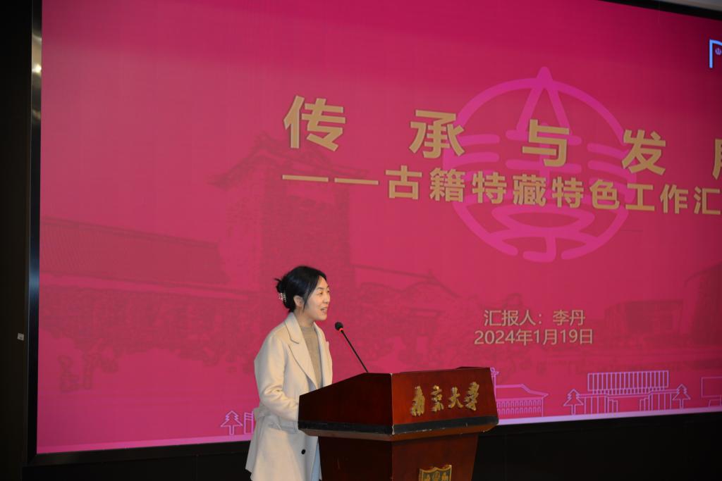古籍特藏部主任李丹老师从阅览室工作、古籍书库工作、特藏文献整理工作、民国书库整理工作、文献修复工作、文献修复内容与数量、古籍数字化工作流程与承担项目全面而详细介绍古籍特藏的日常工作。本年度,成立“南京大学古籍保护与活化实验室”,与南京艺术学院人文学院的联合实训基地揭牌,成功申报“国家级古籍修复技艺传习中心南京大学传习所”并得到授牌。所开设课程《传统印刷装帧体验与文化传承》为“南京大学劳动教育特色实践项目”所支持,参加学生人数近500人次,受到一致好评,并先后为南京大学官微、现代快报、 江苏教育台、中国青年报等多家媒体报道。通过教育育人、展览育人、宣传育人、工作育人方式更好地践行“三全育人“。所有过往,皆为序章。凡是未来,皆可期待。她表示,作为古籍特藏的守护者,要继续做好保护传承、利用和开发工作,讲好中国故事,讲好南大故事。