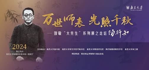 据悉,致敬“大先生”系列展是南京大学图书馆为积极推进“三全育人”在图书馆工作中的融合,借助图书馆在信息资源、人才培养、文化育人方面的优势,联合新生学院七个书院及主要院系部处举办的系列展,获得2023年南京大学机关党委“精诚合作奖”。自2022年11月起,该系列展已圆满完成致敬郭秉文、陶行知、吴有训、戴安邦、顾毓琇、程开甲、吴健雄七位大先生的首轮展出。此次致敬“大先生”系列展之走近陶行知由图书馆、新生学院行知书院、南京大学教育研究院·陶行知教师教育学院及校关工委共同举办,旨在通过更深度地展示大先生的生平及成就,引导广大师生更好地理解和传承他们的爱国精神、科学精神以及奉献精神,树立责任感、使命感,肩负时代重任,凝聚奋进力量,把自身发展融入到实现民族复兴,国家富强的伟大历史进程。