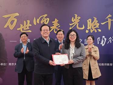 开幕式上,图书馆馆长黄贤金为新生学院行知书院刘雅娇老师颁发了“大先生展”书院阅读推广人证书,行知书院院长赵曙明、陶行知研究院副院长赵娟为行知精神宣讲团成员代表颁发了聘书。