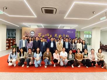 闵铁军宣布致敬“大先生”系列展之走近陶行知开幕。行知书院师生与参加开幕式的嘉宾合影留念。开幕式后,行知精神宣讲团带领师生参观展览。