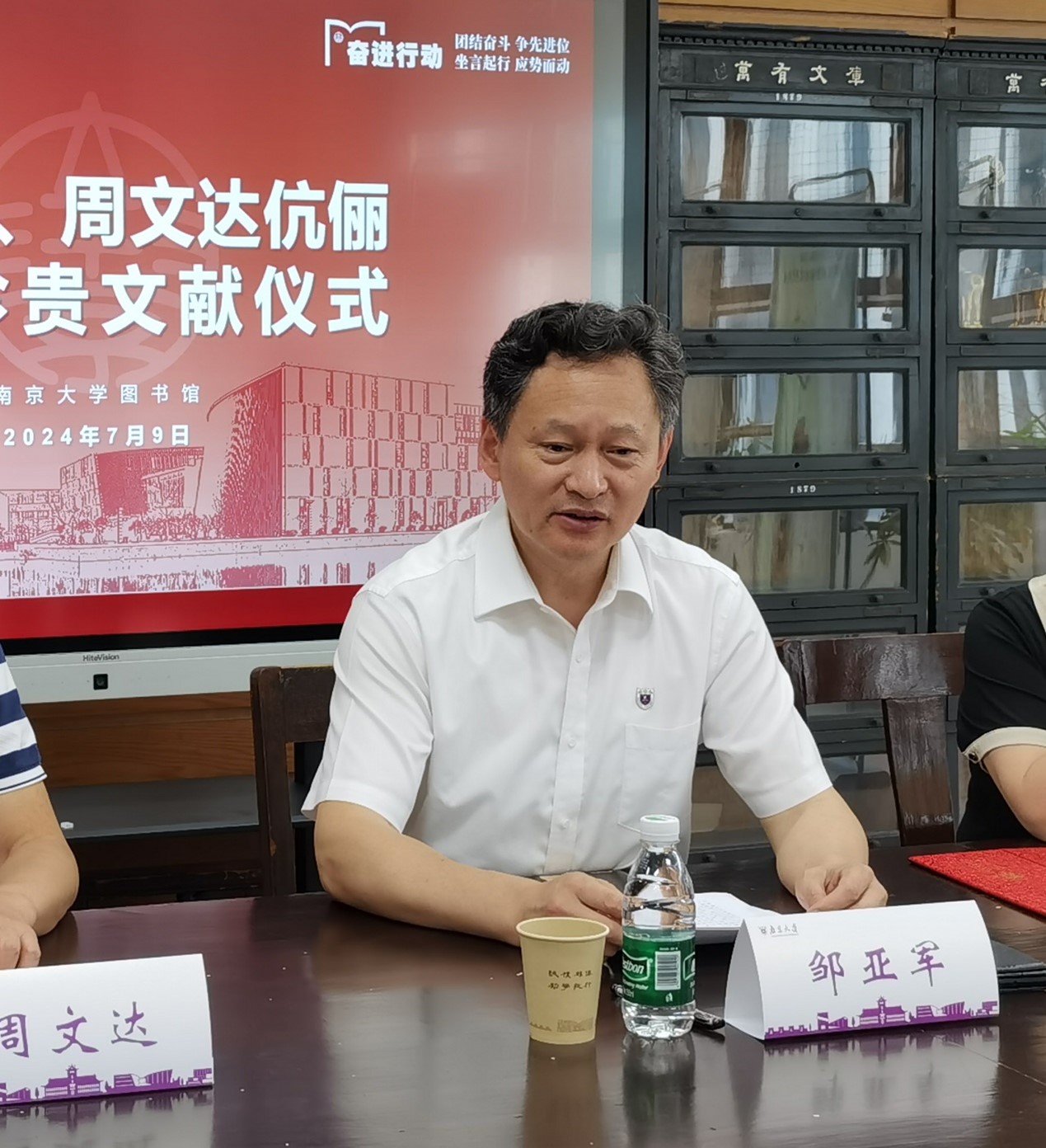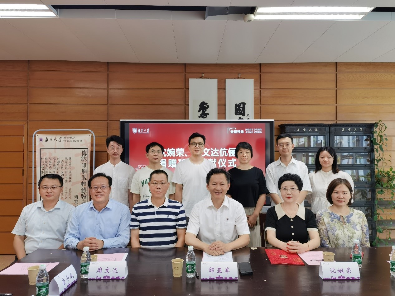 2024年7月9日上午,沈婉荣、周文达伉俪捐赠珍贵文献仪式在仙林校区杜厦图书馆4楼古籍阅览室举行。出席仪式的有南京图灵数码快印、江苏弘道文旅科技等司法定代表人沈婉荣女士,南京大学校友、南京协盛科技等司法定代表人周文达先生,南京大学邹亚军副校长、南京大学资产管理处唐泽威处长、图书馆馆长黄贤金,及图书馆古籍特藏部馆员、相关同学代表参加了仪式。南京大学校友总会冯帆秘书长主持了仪式。