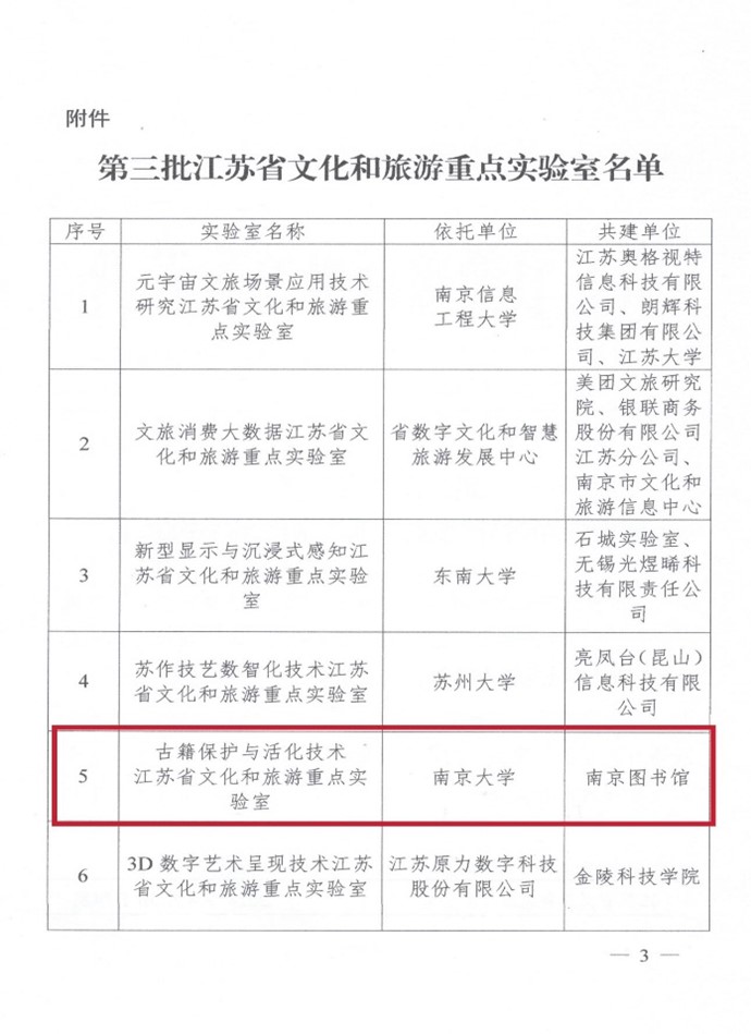 近日,我校图书馆申报的“古籍保护与活化技术” 江苏省文化和旅游重点实验室获得江苏省文化和旅游厅批准,这说明南京大学图书馆在通过古籍保护与活化助力中华文明探源、推进中华民族现代文明建设方面取得了新成果。