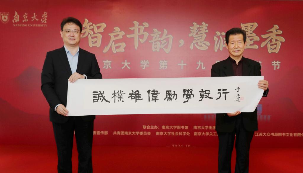 10月26日,南京大学第十九届读书节在仙林校区图书馆举行开幕仪式。本届读书节的主题是“智启书韵,慧润墨香”,由四校区联动举行。中国科学院院士、南京大学校长谈哲敏,校党委常委、副校长索文斌,原副校长、关工委主任闵铁军出席仪式。全国教育书画协会名誉会长兼高等书法教育分会会长、南京大学兼职教授言恭达现场捐赠南京大学校训、校歌书法作品。