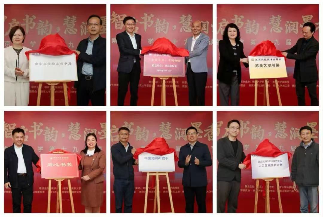 在与会人员的共同见证下,南京大学校友总会秘书长冯帆、图书馆副馆长邵波为校友云书房揭幕。南京出版传媒集团副总经理朱天乐、南大图书馆副馆长罗钧为《金陵全书》捐赠揭牌。江苏凤凰美术出版社总编辑王林军、南京大学艺术学院党委书记石红梅为“苏美艺术书架”揭牌。南京大学统战部常务副部长罗萍,南大侨联代表、电子工程学院院长金飙兵为同心书苑揭牌,罗钧向金飙兵颁发捐赠证书。中国知网东部区总经理卓汪权、南京大学学工部部长李浩为中国知网AI助手揭牌。和鲸科技创始人兼CEO范向伟、南京大学本科生院院长王骏揭牌启动南京大学2024级大学生人工智能素养大赛。