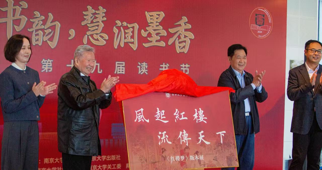 闵铁军、南大文学院教授吴新雷、校团委书记朱翰墨、南大出版社总编助理李亭共同为“风起红楼,流传天下——《红楼梦》版本展”揭牌。
