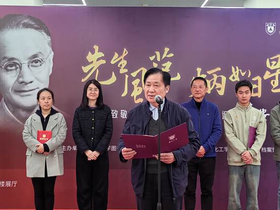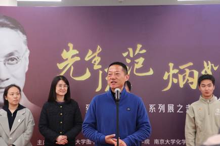 闵铁军在致辞中回顾了戴安邦先生作为南大杰出校友、杰出教师的科学成就、教育成就与家国情怀。他指出,戴安邦先生一生躬耕于三尺讲台,潜心科研、育才树人,用毕生心血诠释了“学高为师、身正为范”的崇高品格,他提出的“全面化学教育”思想,不仅为学科发展指明方向,更培养了一代代兼具科学素养与家国情怀的栋梁之材。他始终心系“国家事”,肩扛“国家责”,将自己的科研成果扎根祖国大地。这种将个人追求融入民族振兴的担当,正是当代青年最需要汲取的精神养分。图书馆举办的“大先生系列展”,正是广大青年学子传承大先生精神品格的好时机,希望广大青年学子以先生为榜样,立鸿鹄志、求真学问,练硬本领,为实现中华民族伟大复兴中国梦贡献南大人的力量。