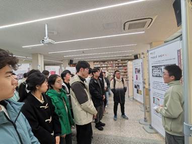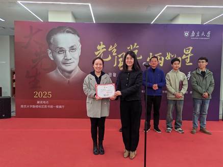 周璐莹老师为郭宏飞、张旭、何佳芮三位同学颁发“大先生展”讲解员证书。