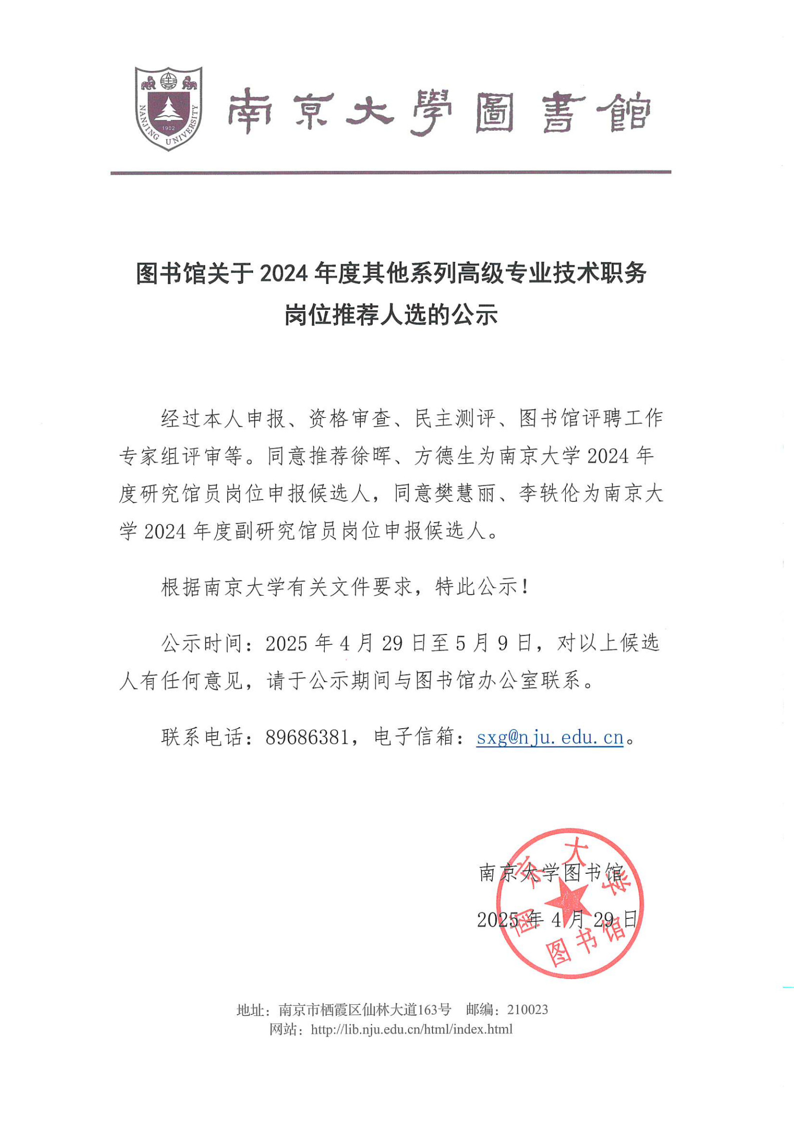 图书馆关于2024年度其他系列高级专业技术职务岗位推荐人选的公示