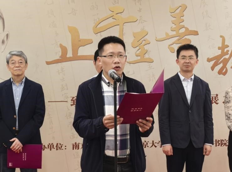 2025年4月30日,“止于至善 教泽东南”——致敬“大先生”系列展之走近郭秉文在南京大学鼓楼校区图书馆正式开幕。南京大学原副校长、校关工委常务副主任闵铁军,新生学院秉文书院院长周宪,新生学院党委书记施林淼,外国语学院德语系教师李彬,新生学院秉文书院学生事务办公室主任周围,学生发言代表戚明国等出席开幕式。闵铁军讲话并宣布致敬“大先生”系列展之走近郭秉文开幕。南京大学图书馆馆长黄贤金主持活动。