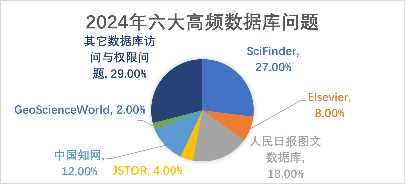 由于服务系统及网络安全及维护等方面原因,数据库访问与权限问题主要涉及六个高频数据库:SciFinder、Elsevier ScienceDirect、JSTOR、Geoscience World、中国知网、《人民日报》图文等数据库。这些问题主要集中在数据库的使用权限、访问稳定性以及校外访问流程等方面,影响了相关读者的科研效率和学习体验。如,Geoscience World(GSW)数据库的用户反馈显示,多校区用户反映无法下载非OA文献,且IP权限不稳定,导致部分用户无法获取所需资源。。Elsevier ScienceDirect数据库也存在学生邮箱无法通过机构认证,校外VPN跳转异常,限制了用户的访问权限。