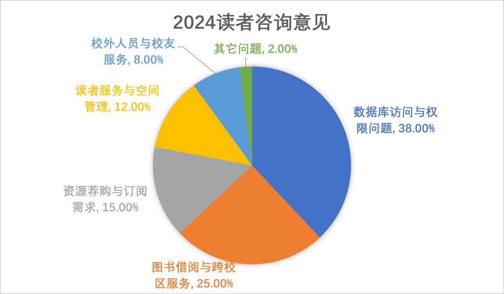 2024年,南京大学图书馆共收到读者意见与反馈450条,较2023年的1126条显著减少,同比下降了约60%。这些反馈主要通过线上渠道(OA校务信箱、图书馆留言板、微信公众号留言、参考咨询邮箱)收集,涵盖数据库使用、图书借阅、资源荐购、读者服务、设施维护、校外访问等六大核心类别。数据统计显示,数据库访问与权限问题占比最高,达38%;其次是图书借阅与跨校区服务,占比25%。结果具体如下: