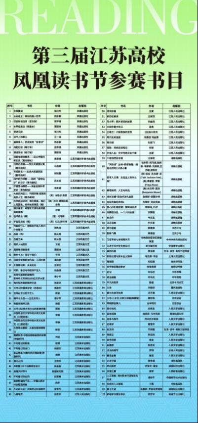 为进一步学习贯彻党的二十大精神,倡导全民阅读新高潮,推动高校图书馆发挥阅读引领作用,弘扬中华优秀传统 文化,激发大学生对深度阅读的关注,江苏省高等学校图书情报工作委员会、江苏省全民阅读促进会、江苏省书香全民 阅读基金会、江苏凤凰出版传媒股份有限公司、江苏凤凰新华书店集团有限公司联合主办“书香润校园阅读启智慧 ” 第三届江苏高校凤凰读书节。