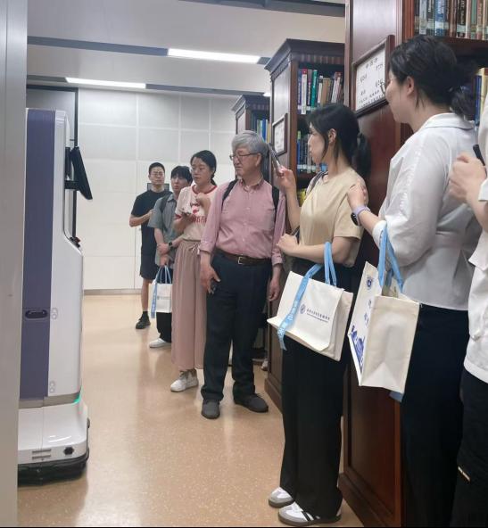 代表团一行实地考察了图书馆二楼功能区域及四楼外文阅览区的空间布局,观看了图书馆参与研发的图客盘点机器人智能化操作流程,了解了人工智能技术在图书精准盘点领域的应用成果。