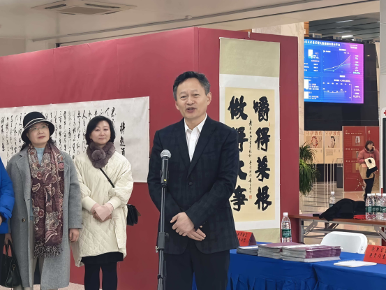 史梅深情回顾了南京大学自李瑞清先生以来的书法教育传统,介绍了胡小石等书法名家的贡献以及孙晓云中国书法研究院的成立,强调了图书馆作为文化传承枢纽的重要作用。并对袁志康校友将书法展首站设于母校图书馆表示热烈欢迎与感谢,认为此举为仙林校区增添了浓厚的艺术氛围与人文气息。