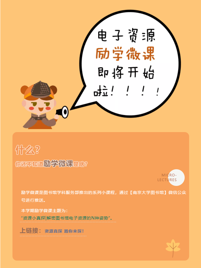 励学微课是图书馆学科服务部推出的系列小课程,通过【南京大学图书馆】微信公众号进行推送。